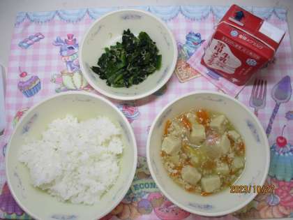 今日の献立は、「ごはん・牛乳・高野豆腐のそぼろ煮・ほうれん草とじゃこのいためもの」でした。