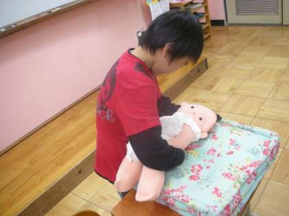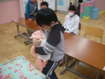 子どもたちの赤ちゃんの頃の話を聞きました。可愛かったのでしょうね。(もちろん今も可愛いです!)お母さんのお腹の中にいた頃や,生まれた時の様子などを,学習しました。その後,実物大の赤ちゃん人形を抱っこしたり,トントンあやしたりしました。優しいお兄さんお姉さんでした。