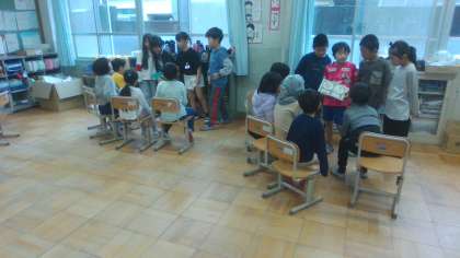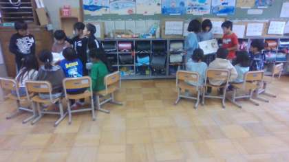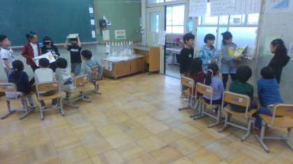 国語科「はんで意見をまとめよう」で1年生が本を好きになってくれるような読み聞かせをするために、班で話し合って読む本を決めました。それぞれ決まった本を読む練習して、少し緊張しながらも1年生に一生懸命読み聞かせをすることが出来ました。