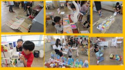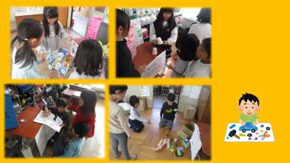 生活科の学習では、ペットボトルや牛乳パックなど、身近にある物を使って遊びや遊びに使うおもちゃを工夫して作りました。今週の月曜日、2年生が考えた遊びやおもちゃを1年生にも楽しんでもらおうと『おもちゃランド』を開催しました。1年生がとても楽しそうに遊んでくれたので、2年生も達成感を感じることができました。