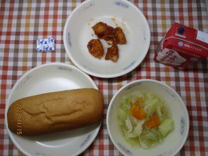 今日の献立は、全粒粉パン・牛乳・チキンのアングレス・野菜のスープ煮・チーズでした。