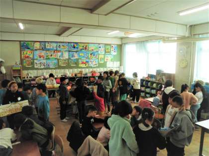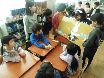 国語科「はんで意見をまとめよう」で、1年生が本を好きになってくれるような読み聞かせをするために、班で話し合って読む本を決めました。