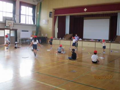 2年生の体育の「ゆっくりかけ足」「なわとび」の様子です。