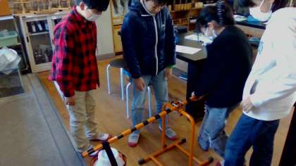 てこを使って、10kgのおもりを持ち上げる実験をしました。