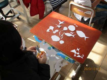 宇宙の世界や海の世界、動物の世界など、いろいろな世界の想像をふくらませて、型紙を一生懸命つくっていました。細かい形にも挑戦していました。