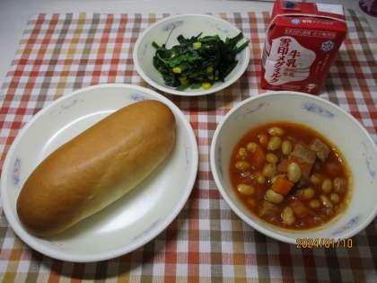 今日の献立は、ミルクコッペパン・牛乳・ポークビーンズ・ほうれん草のソテーでした。
