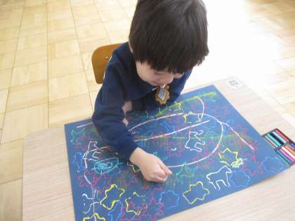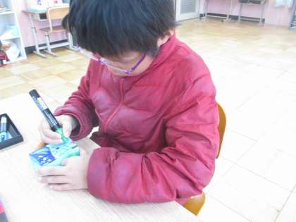 2月の始めに、京都市の育成学級合同の展覧会が開催されます。その展示作品の制作をしています。版画に、自分や友達をかき加えたり、気球のバスケット(乗るところ)に、絵をかいたりしています。少しずつ仕上がってきています。