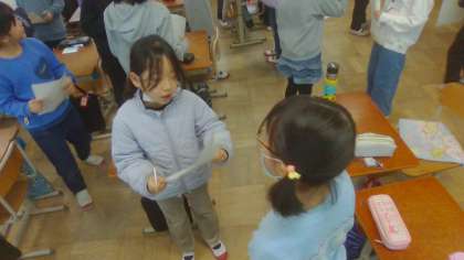 久しぶりの友達との再会で話をしたい子も多くいると思います。そこで3年生は「冬休みにしたことビンゴ」をしました。