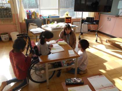 写真左は、1年2組といっしょに道徳「うちゅうせんにのって」を学習している様子です。素敵な場所やものについて出し合いました。