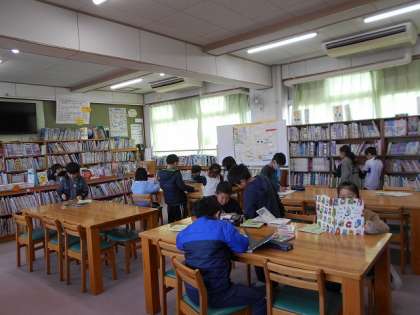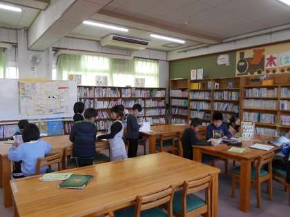 本を借りたり、読んだりしています。「この番号の本はどこにあるんだろう。」「その番号の本はあちらの棚にあるよ。」と先生に聞きながら本を探していました。
