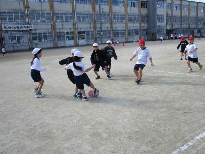 「ボールけりゲーム」ボールを足で扱う遊びは初めてですが、失敗を気にせずに積極的に取り組んでいます。手の代わりに足を使ってパスをしてシュートにつなげるのは難しいですが楽しみながら活動しています。