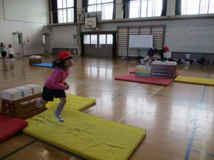 「とびばこあそび」こちらも初めての学習です。とびのり・とびおりから始まり、とびこし(開脚跳び)遊びなど難しい技に挑戦していきます。