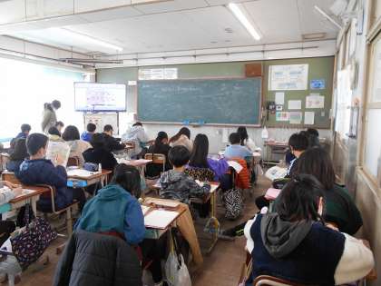Let's listenでは、地図を見ながら図書館や郵便局がどこにあるのか聞き取りました。もう一度聞きたいと先生に「one more!」とお願いしたり、会話を聞いて地図と照らし合わせて、目的地がどこにあるのか探しました。