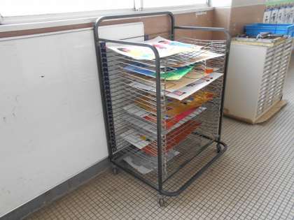 今日は、色塗りを進めました。太い筆と細い筆を使い分け、どの場所から塗るか、どの色がいいかを工夫しました。できあがった作品は乾かしています。