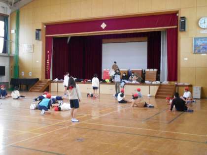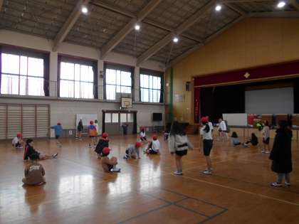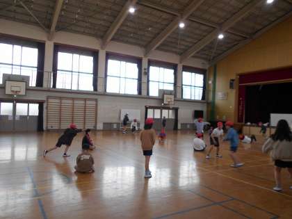 リズムに合わせて体を動かしたり、なりきって動いたりする「表現運動」を行いました。