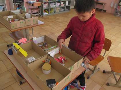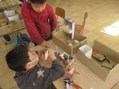 図画工作で取り組んでいる「ともだちハウス」が、どんどん拡張しています。作りながら、遊びながら、友達同士で会話が広がる姿が素敵です。