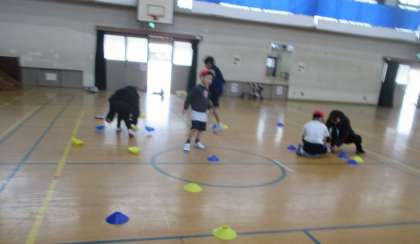 今日は、4組全員で、体育館で体つくり運動をしました。メインは、「男女対抗コーン返し」床に広げた皿コーン(薄型のマーカー)を男女対抗で、時間を決めて、ひっくり返し合います。返したと思ったら、後ろから近づく影。すぐに、ひっくり返されてしまいます。1分間対抗ですが、なかなか運動量があります。その他、フープ回しなどにもチャレンジしています。