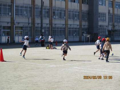 3時間目の運動場は、太陽が出ていてポカポカしていました。そのため、子どもたちは「あつくなってきた!」と言いながら、懸命にボールを追いかけ、がんばっていました。
