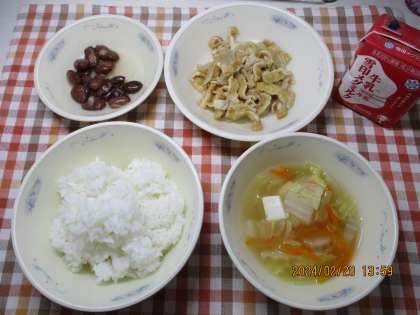今日の献立は、ごはん・牛乳・きつね丼(具)・金時豆のあま煮・はくさいの吉野汁でした。
