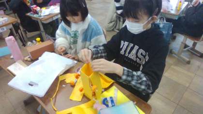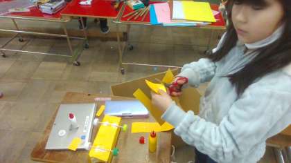 図画工作科「ゴーゴードリームカー」では、牛乳パックの本体に立体的な装飾をし