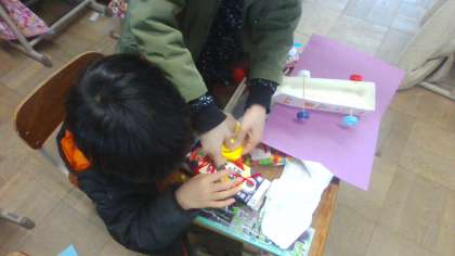 竹串やペットボトルキャップを使いながら、走る車を製作しています。