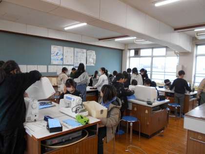 家庭科でミシンを使ってエプロンを作るため、ミシンの安全な使い方を学びました。