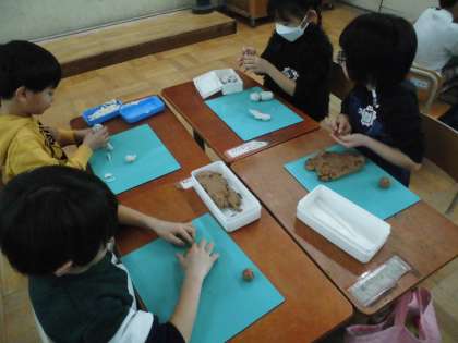 子どもたちは、「わにとおさんぽしてみたいな。」「かわいい動物がいいな。」などと話しながら、楽しく活動に取り組みました。まるめたり、のばしたり、ねじったり、つまんだり…。色々な技を組み合わせながら作品を完成させることができました。