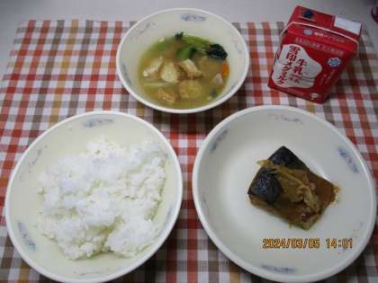今日の献立は、ごはん・牛乳・さばのみそ煮・厚あげの野菜あんかけでした。