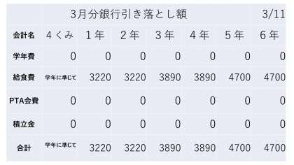 ※2月3日以降に学級閉鎖のあった学級は、上記額より閉鎖日の給食費を差し引いた金額を引き落とします。