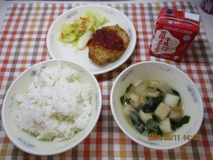 今日の献立は、麦ごはん・牛乳・トンカツ・ソテー・みそ汁でした。