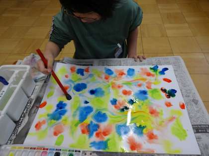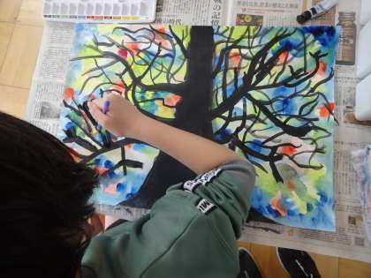 豆太が見たようなモチモチの木を描いてみたくなり、絵の具を使って表現しました。画用紙を水で濡らし、絵の具を落としてにじませました。その画用紙に黒の絵の具で大きな木を書いていくと、木に花が咲いたようにきれいなモチモチの木ができました。