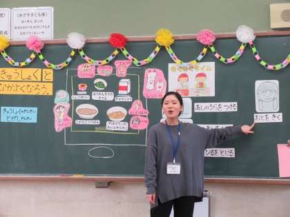 今日から今年度の給食が始まり、1年生では給食について栄養教諭の冨樫先生から教えてもらいました。