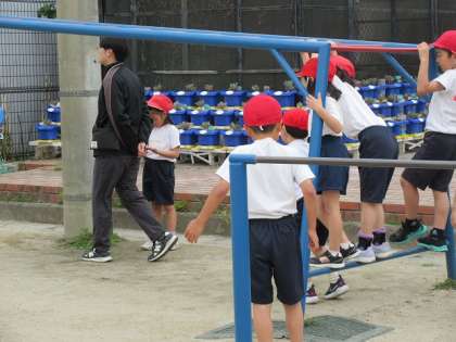 朝から元気よく、うんていをしたり、鉄棒をしていました。先生に、「逆上がり出来たし、見て。」と声をかけている子もいました。