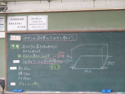 この水槽のガラスの厚さは1cm。どのように考えて計算するといれものの容積を求めることができるのか、じっくり考える子どもたち。