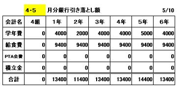 金額をご確認の上、5月9日(木)迄に、ご入金をお願いします。現金納入になりませんよう、保護者のみなさま、ご協力ください。