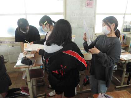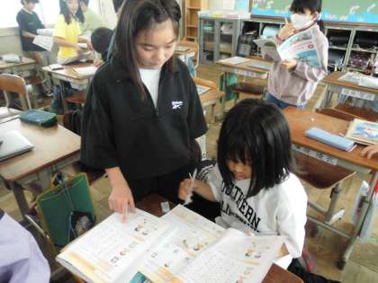 先生たちに自分のことを紹介するため、好きなものや好きな教科を伝えたり、自分の名前のつづりを言ったりできるように学習を進めています。この日は、お互いに名前のつづりを伝えあい、聞き取ってノートに書くやりとりを楽しみました。