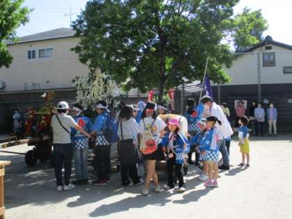 晴天に恵まれ、今年も楽しみにしていた「唐橋子どもみこし」の日がやってきました。朝早くから、大勢の子どもたちが西寺公園に集まりました。