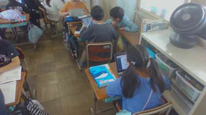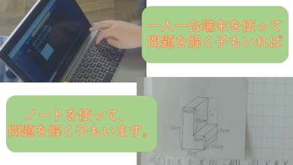 例えば、算数では、体積の問題で、複雑な形の体積の問題を公式を使って求めるためにどのように工夫すればよいかを端末を使って考えました。グループで考えて問題を解く子や一人でじっくり考える子など様々な方法で考えていました。