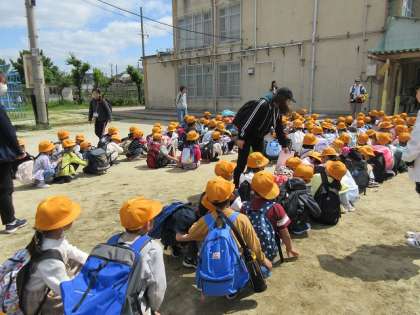 今日は、1年生と2年生の遠足です。2年生が1年生の手を取って、一緒に出掛けました。
