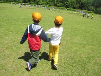 1,2年生で、梅小路公園へ遠足に行きました。朝は少し肌寒い感じでしたが、公園につく頃には、よい天気になりました。広い芝生広場で、「だるまさんが転んだ」をしたり、お弁当を食べたり、探検したり、体をいっぱい使った1日になりました。