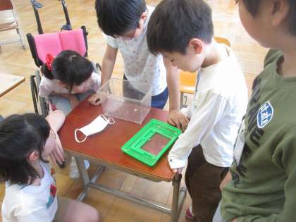 今日の6校時、飼育籠を見ていた2年生の、「なんか、動いている。」との言葉から始まりました。近づいてみると、「今、生まれている。」本当に、まさにその時、さなぎからモンシロチョウが出てくる瞬間でした。殻を脱ぎ、たたまれていた羽を必死で伸ばそうとする姿がありました。羽が伸び切るまでは結構な時間がかかりました。みんな初めて見る瞬間でした。