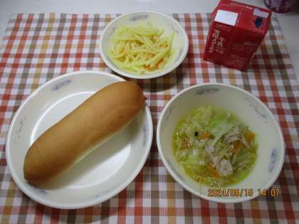 今日の献立は、コッペパン・牛乳・肉だんごのスープ煮・じゃがいものいためものでした。