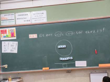 めあては「10をわけて、いくつといくつになるか、かんがえよう」でした。子どもたちは、数図ブロックを使って考えていました。