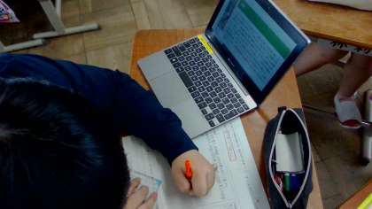 「伝えよう〜平和のために今、私たちができること〜」という大きなテーマで学習をしています。今日は太平洋戦争や原爆ドームなどについてタブレットを使って調べました。
