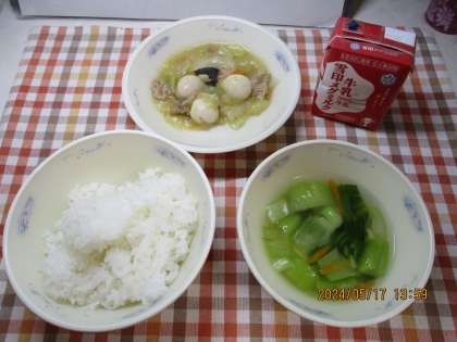 今日の献立は、ごはん・うずら卵とキャベツのいため煮・とうふと青菜のスープでした。