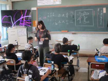 4年生になって初めての毛筆。今日は、『花』という字うぃ筆使いと画の方向に気を付けて書きました。