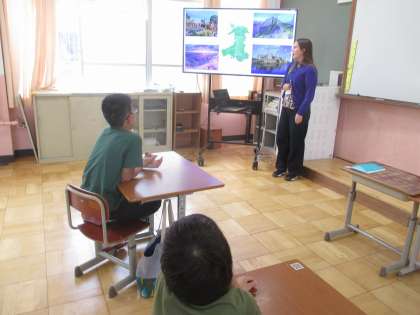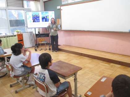 ジョー先生に来ていただいて、外国語の学習をしました。ジョー先生の自己紹介クイズにみんな興味津々で答える姿がありました。