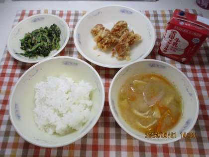 今日の給食は、「ごはん・牛乳・鶏肉のこはくあげ・だいこん葉のごまいため・いものこ汁」でした。