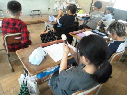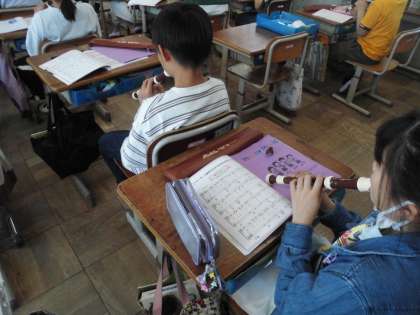 音楽科「風のメロディー」の学習では、リコーダーと歌声が重なり合う響きを感じながら取り組んでいます。リコーダーでは、「♭シ」の音が新しく学習し、運指に気を付けて、演奏しています。