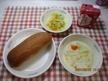 今日の献立は、黒糖コッペパン・牛乳・コーンのクリームシチュー・ソテーでした。